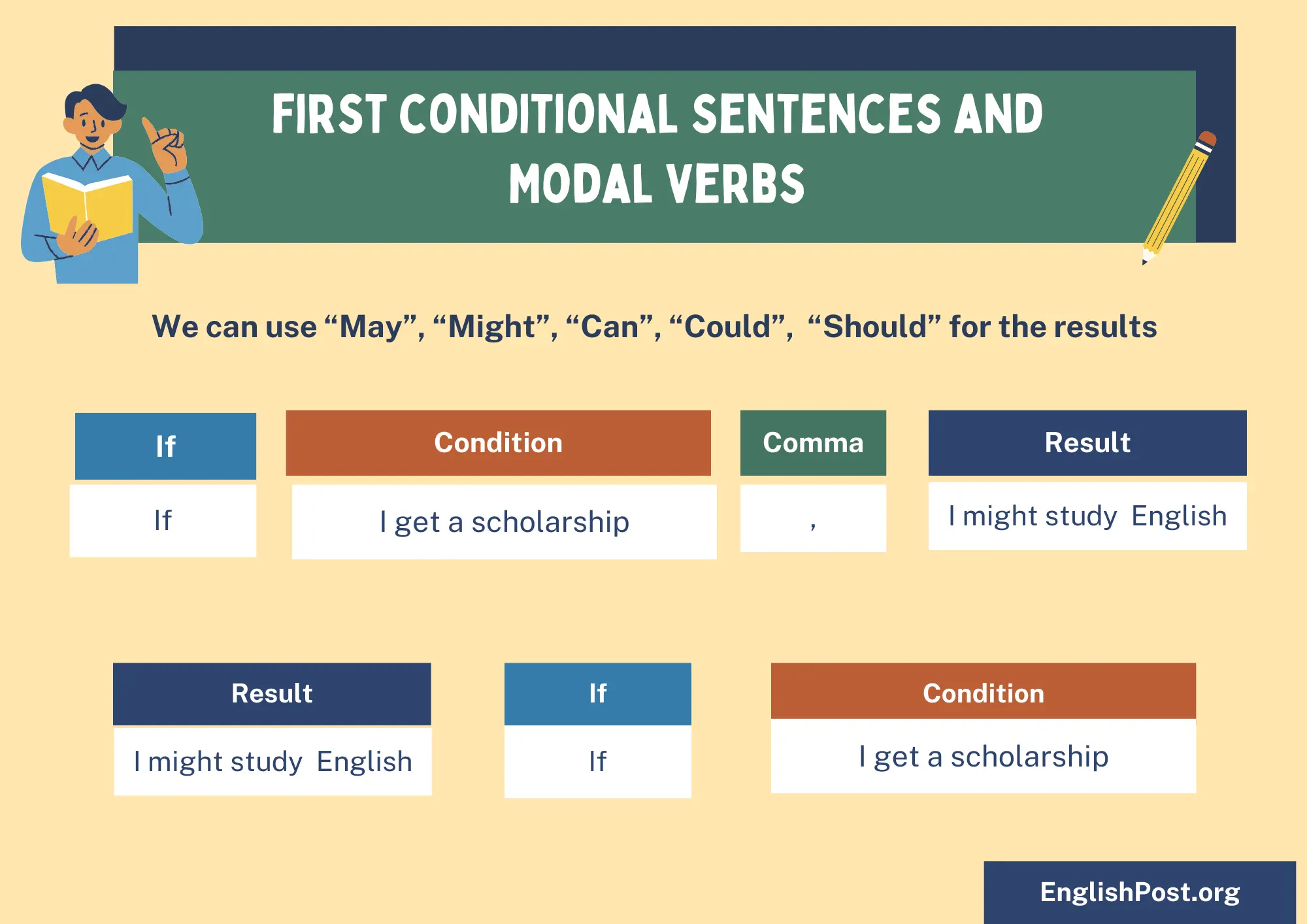 These are some of the examples of modal verbs that we can use to make first conditional sentences
